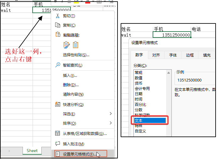 etc. 电话号码这一列需要是文本格式。